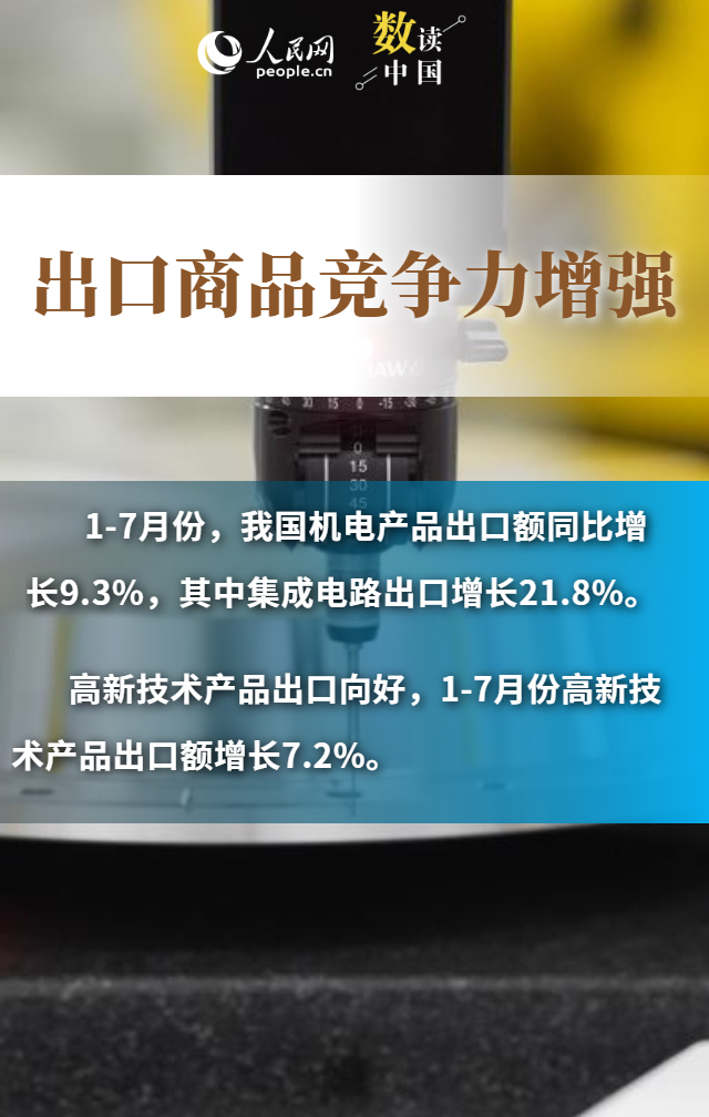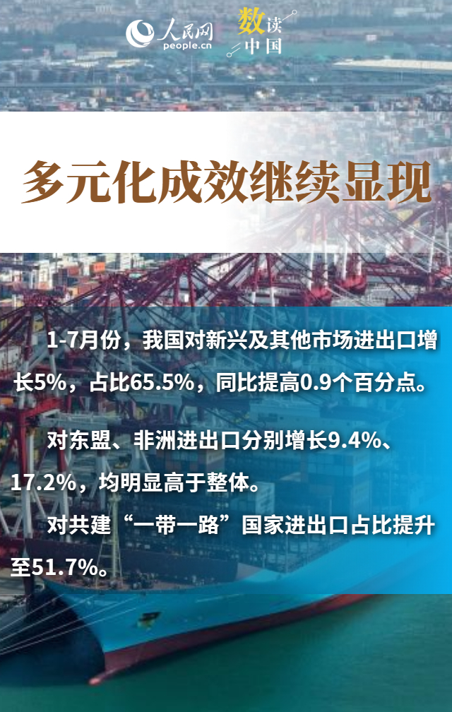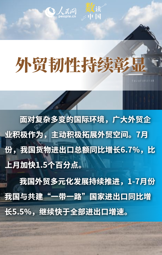 進出口規(guī)模創(chuàng)歷史新高、“朋友圈”不斷擴大、民營企業(yè)持續(xù)創(chuàng)新……數(shù)據(jù)顯示,今年前7個月,我國貨物貿易進出口總值25.7萬億元,同比增長3.5%。在外部挑戰(zhàn)之下,我國貨物進出口持續(xù)增長,展現(xiàn)出較強韌性和活力,為世界經濟復蘇注入了中國力量。