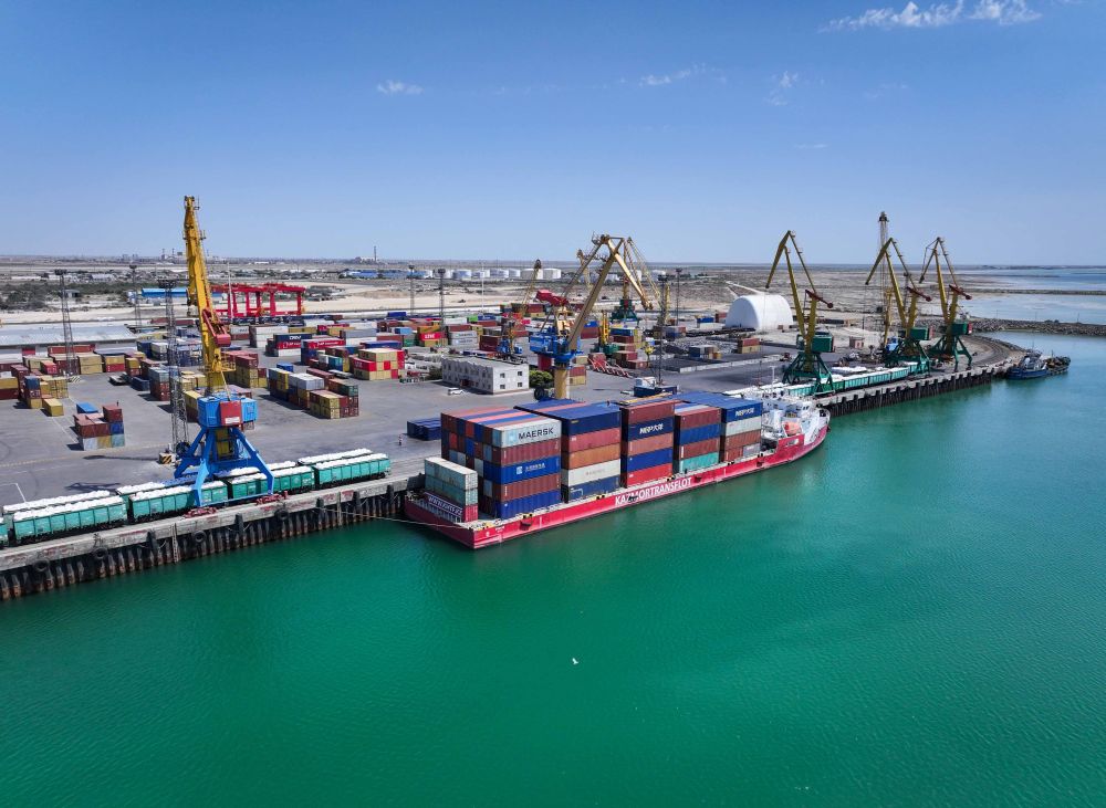 8月6日,一艘貨輪??吭诠_克斯坦阿克套港(無人機照片)。新華社記者 李任滋 攝
