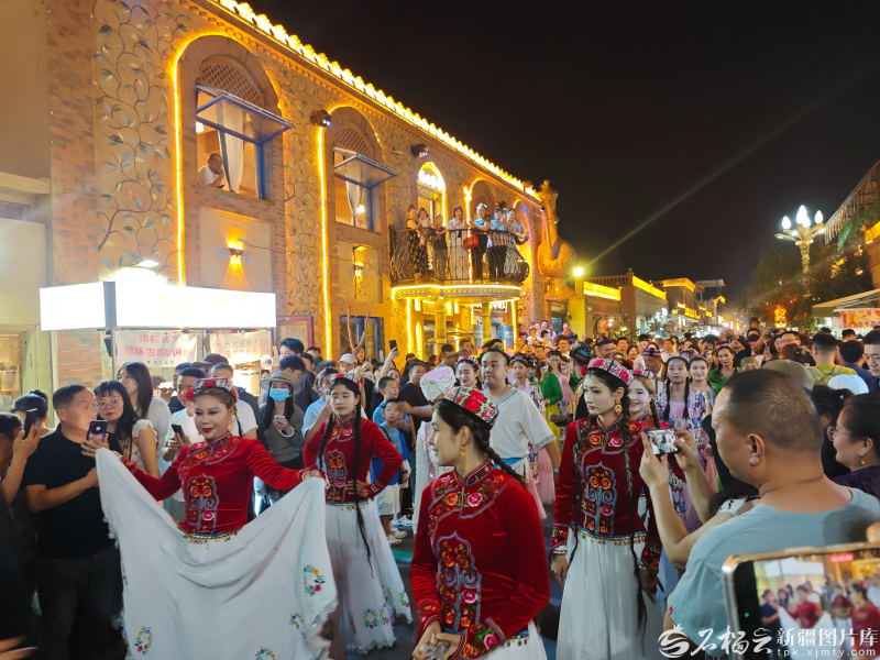 游客在阿勒屯古街觀看歌舞表演。石榴云/新疆日報(bào)記者 宋海波攝