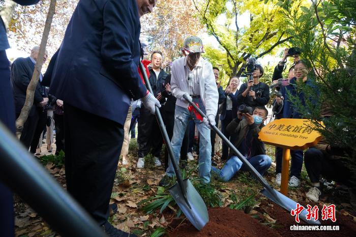 2023年11月3日,美國(guó)飛虎隊(duì)老兵哈里·莫耶在昆明與中方代表共植友誼樹。中新社記者 劉冉陽(yáng) 攝