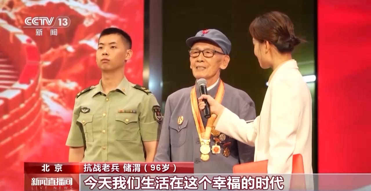 抗戰(zhàn)老兵 儲(chǔ)渭(96歲):我當(dāng)兵的時(shí)候不到15歲,現(xiàn)在老戰(zhàn)友已經(jīng)不太多了。經(jīng)歷了14年的抗日戰(zhàn)爭(zhēng),今天我們生活在幸福的時(shí)代,這是黨的關(guān)懷,這是我們不能忘記的。