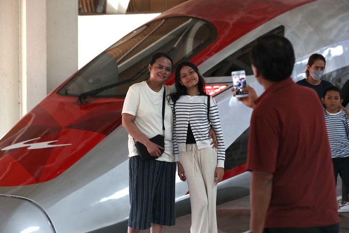 6月19日,在印度尼西亞雅加達(dá)哈利姆站站臺,兩名乘客與雅萬高鐵高速動車組列車合影。 新華社記者 岑云鵬 攝