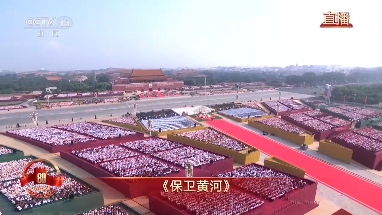 紀念大會開始前,天安門廣場上千人軍樂團、合唱團奏唱抗戰(zhàn)歌曲《保衛(wèi)黃河》。