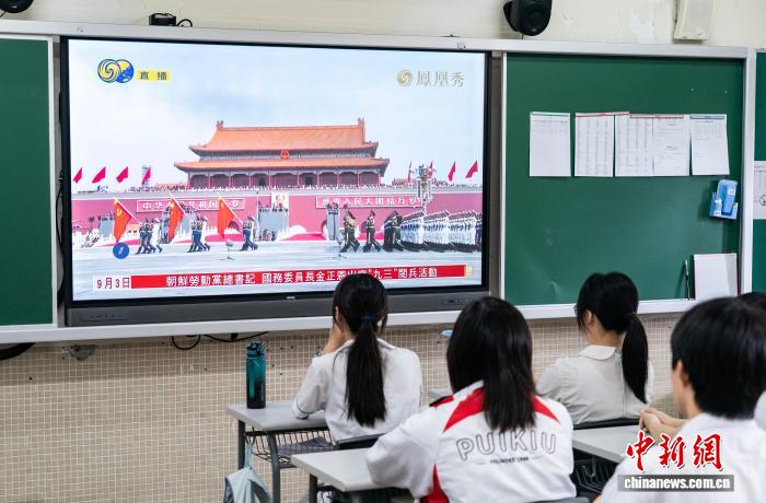 9月3日,香港培僑中學(xué)學(xué)生觀看紀(jì)念中國人民抗日戰(zhàn)爭暨世界反法西斯戰(zhàn)爭勝利80周年大會直播。中新社記者 侯宇 攝