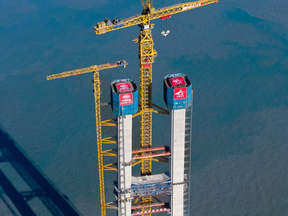 圖為雙嶼門特大橋首個(gè)主塔封頂施工現(xiàn)場(chǎng)。(中國鐵建大橋局供圖)