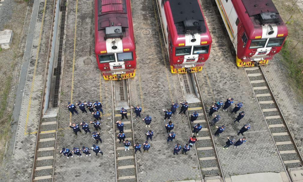 2025年8月19日,在肯尼亞內(nèi)羅畢非洲之星鐵路運營有限責(zé)任公司機務(wù)運轉(zhuǎn)整備場,中肯兩國鐵路工作者在機車前站列并組成“3000”字樣,以紀(jì)念蒙內(nèi)鐵路實現(xiàn)安全運營3000天(無人機照片)。新華社記者 楊光 攝