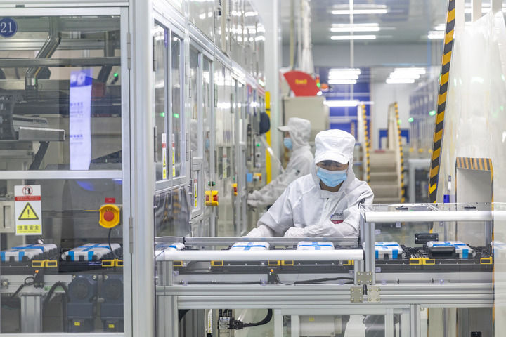 2024年9月27日,在位于重慶市銅梁區(qū)的海辰儲能重慶制造基地,工作人員在生產(chǎn)線上初步檢測兩個(gè)電芯是否配對。