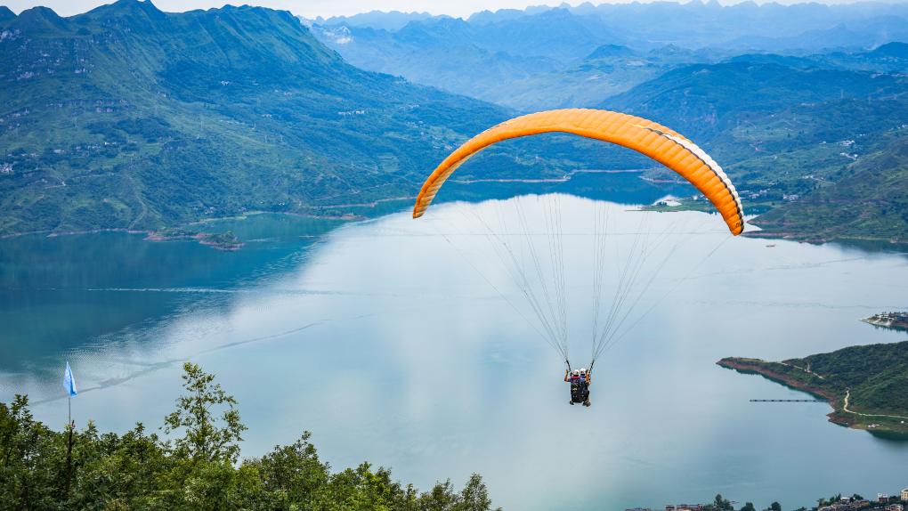 7月9日,游客在教練的陪同下體驗低空滑翔飛行?;鑲氵@一低空旅游項目成為了貴州省六盤水市眾多游客的新選擇。新華社記者 陶亮 攝