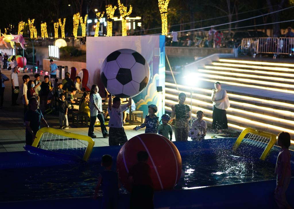8月17日,在江蘇南京舉行的2025江蘇省城市足球聯(lián)賽第九輪比賽中,南京隊對陣鹽城隊。南京市在部分商場、街區(qū)等地設置觀賽“第二現(xiàn)場”,使用大屏幕同步直播賽事,同時設有游戲互動區(qū)、煙火市集區(qū),讓球迷們度過歡樂時光。新華社記者 季春鵬 攝