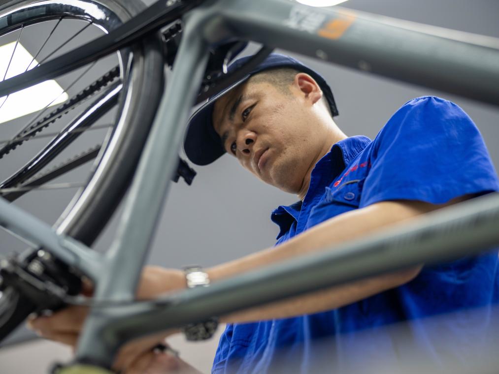 7月16日,在吉林化纖集團復材體育休閑裝備產(chǎn)業(yè)園,工人組裝碳纖維自行車車架。新華社記者 邵澤東 攝