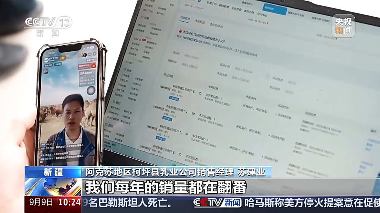阿克蘇地區(qū)柯坪縣乳業(yè)公司銷售經理 蘇建業(yè):我剛才播了大概有1個小時,已經賣了有4萬多元了,我們每年的銷量都在翻番。