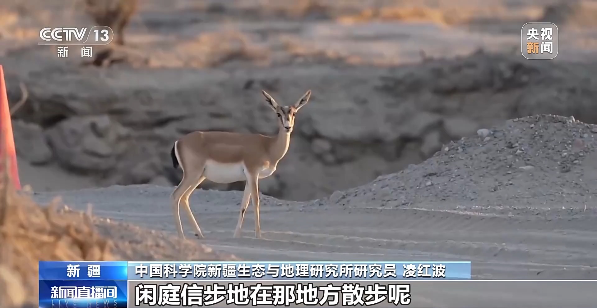 中國科學院新疆生態(tài)與地理研究所研究員 凌紅波:黃羊不怕人了,閑庭信步地在那兒散步呢。這就是人與自然和諧相處。