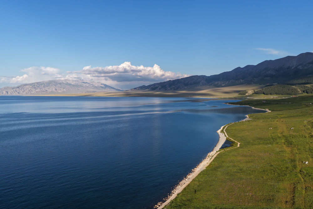 ↑ 賽里木湖一景(無人機(jī)照片,7月8日攝)。