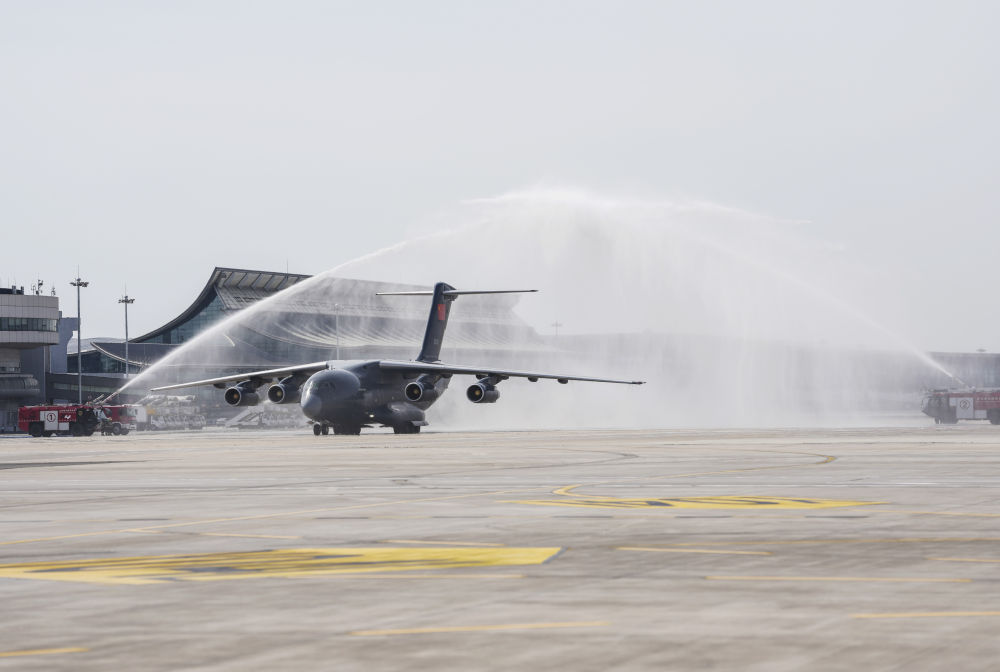 9月12日,第十二批在韓中國(guó)人民志愿軍烈士遺骸回國(guó)。這是在沈陽(yáng)桃仙國(guó)際機(jī)場(chǎng),接運(yùn)烈士遺骸回國(guó)的運(yùn)-20專機(jī)通過(guò)水門(mén)。新華社記者 潘昱龍 攝