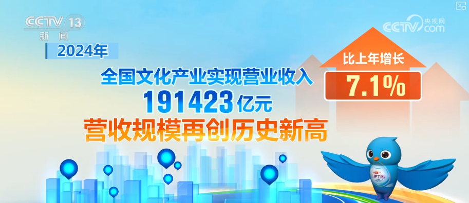 2024年,全國文化產(chǎn)業(yè)實現(xiàn)營業(yè)收入191423億元,營收規(guī)模再創(chuàng)歷史新高,比上年增長7.1%。2024年,文化服務(wù)業(yè)實現(xiàn)營業(yè)收入109134億元,比上年增長7.4%,占全部文化產(chǎn)業(yè)營業(yè)收入的比重為57.0%,文化服務(wù)業(yè)對文化產(chǎn)業(yè)營業(yè)收入增長的貢獻率為59.1%。