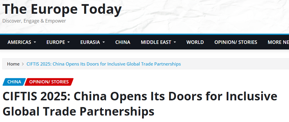今日歐洲網(wǎng)站(The Europe Today)13日的報(bào)道指出,服貿(mào)會(huì)展示了中國(guó)對(duì)包容、開放和前瞻性的服務(wù)貿(mào)易的承諾。中國(guó)持續(xù)擴(kuò)大市場(chǎng)準(zhǔn)入,為全球企業(yè)創(chuàng)造廣闊機(jī)遇。