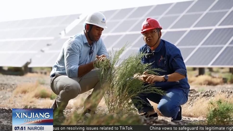 外籍主持人林肯探訪了全球最大的“草光互補”光伏基地——阿合雅光伏產(chǎn)業(yè)園。這片由181萬塊光伏板組成的藍色海洋,占地493公頃,相當于700個標準足球場。不僅能夠提供滿足約43萬人全年用電需求,還兼具治沙功效。中國華能集團烏什光伏電站負責人周博表示,這類光伏設(shè)施能夠穩(wěn)固土壤、防止侵蝕,板面凝結(jié)的水珠還可灌溉下方土地,支持植物持續(xù)生長。“戈壁奇跡”的背后,是國家實現(xiàn)“雙碳”目標而推動的生態(tài)與能源的“雙向奔赴”。