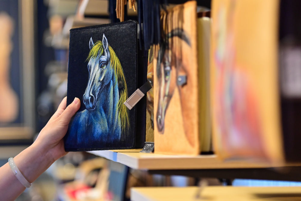 “伊犁是‘天馬之鄉(xiāng)’,我們在皮毛一體的馬皮上進行手工繪畫,每幅圖案都是獨一無二的,讓非遺與旅游深度融合?!钡觊L茹柯耶·艾散介紹,店鋪還開發(fā)出馬毛筆記本、首飾等文創(chuàng)衍生品,深受年輕人喜愛。