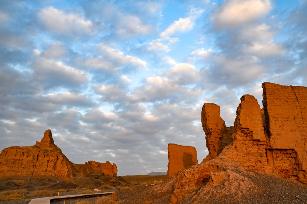“克孜爾尕哈”意為“紅色哨卡”。夕陽下,這座漢代軍事設(shè)施的夯土墻體被映照得棱角分明,泛著淡淡的金紅色?!罢驹谶@里,仿佛看到了當(dāng)年的烽火傳訊?!币幻慰透锌卣f。