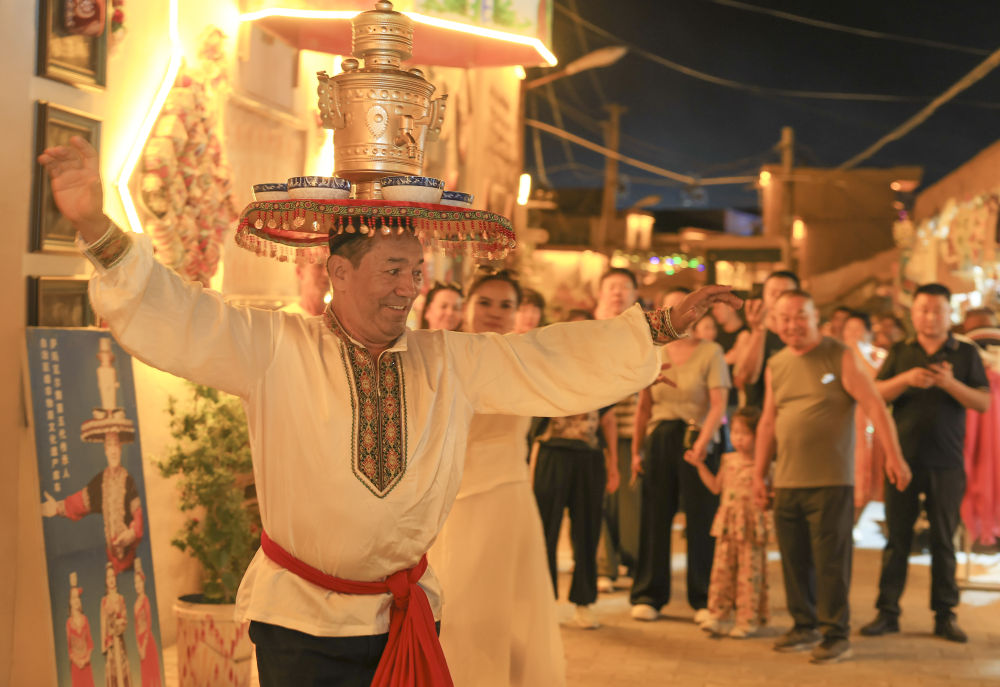 夜幕降臨,煙火氣息在庫車?yán)铣菑浡?。廣場上傳來歡快的樂曲聲,舞者頭頂銅盤銅壺,腳步輕快,將迎賓之禮——薩瑪瓦爾舞展現(xiàn)在游客面前,掌聲與歡笑聲此起彼伏。