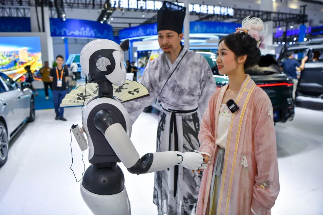 2024年4月15日,海南???,第四屆中國國際消費品博覽會上,身著漢服的參觀者與“柔美人形智能服務機器人”互動。中新社記者 駱云飛 攝