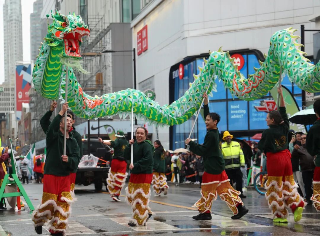 當地時間2025年3月16日,加拿大多倫多,在慶祝愛爾蘭民族傳統(tǒng)節(jié)日圣帕特里克節(jié)(St. Patrick’s Day)的大游行中,一支中式舞龍隊舞動綠色長龍。中新社記者 余瑞冬 攝