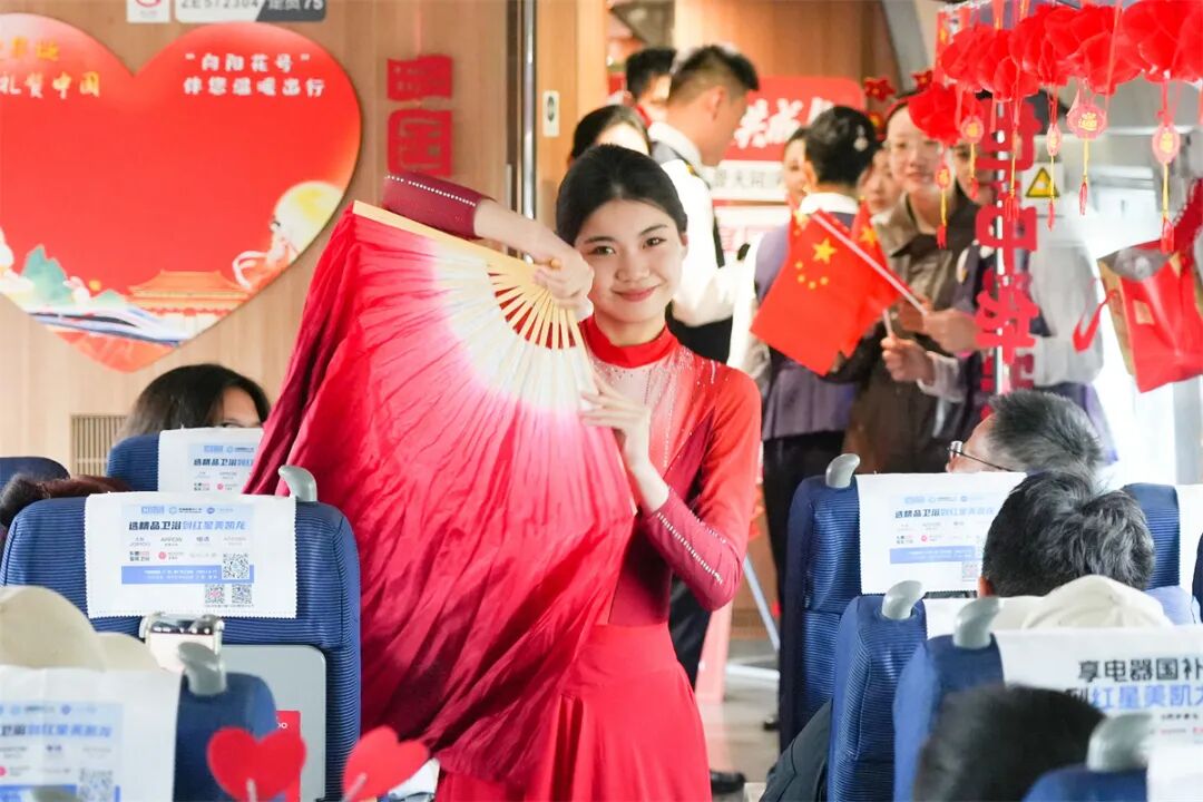 車廂內(nèi)掛滿條幅、彩帶和中國結(jié),洋溢著節(jié)日的喜慶氛圍。在舞蹈《親愛的你啊》的優(yōu)美旋律中,列車聯(lián)歡拉開序幕。