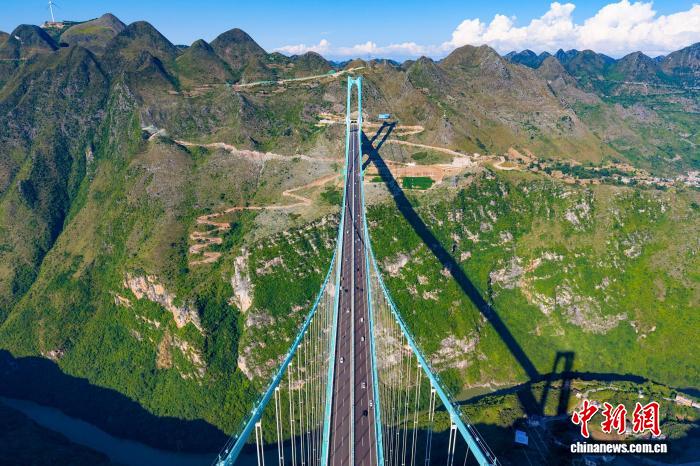 該橋主橋跨徑居山區(qū)橋梁跨徑世界第一、橋梁高度居世界第一。眾多游客慕名前來,或踏上透明玻璃步道體驗(yàn)“云端漫步”,或在大橋觀景平臺(tái)、周邊村寨尋找最佳角度,與這座“橫豎都是世界第一”的大橋合影留念。