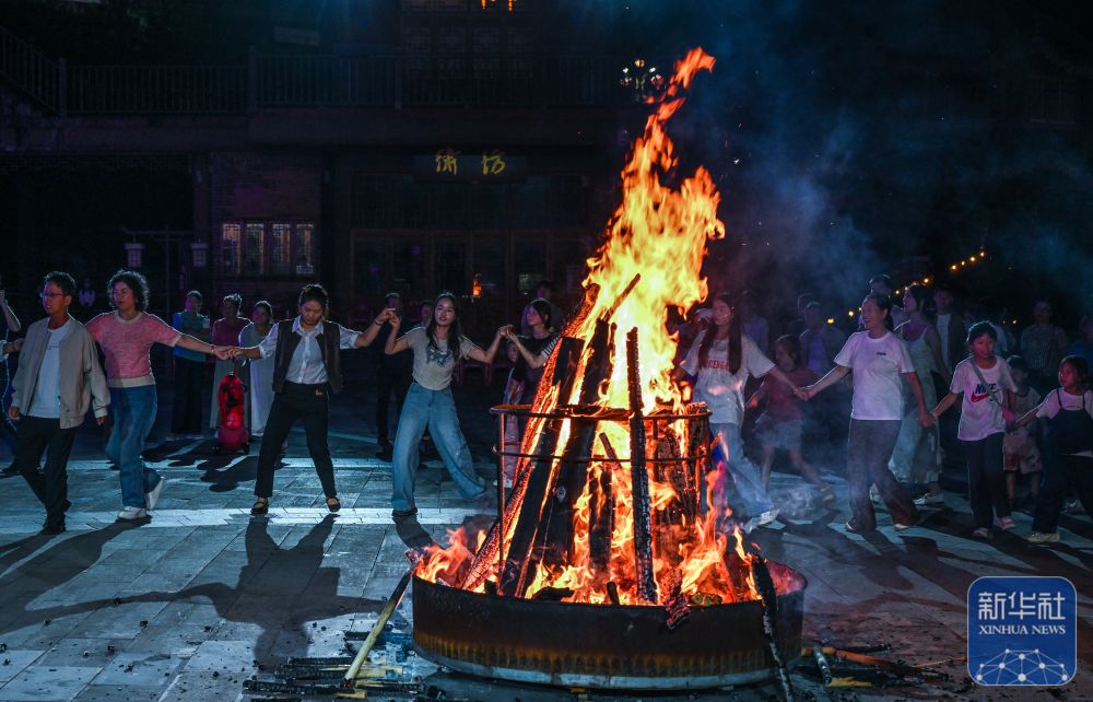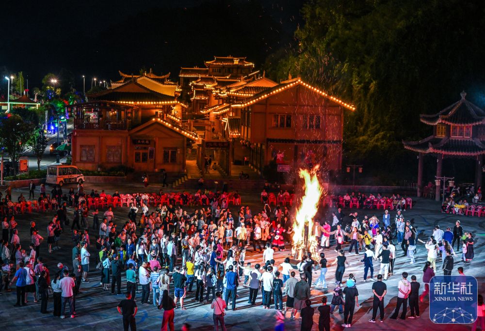 ↑ 10月5日晚,在貴州省晴隆縣阿妹戚托小鎮(zhèn),游客與當?shù)厝罕妵艋鸸参?。新華社記者 楊文斌 攝