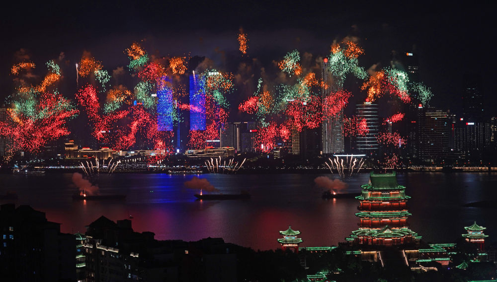 10月1日,2025年南昌市國(guó)慶煙花晚會(huì)在江西省南昌市贛江老官洲水域舉辦。新華社記者 萬(wàn)象 攝