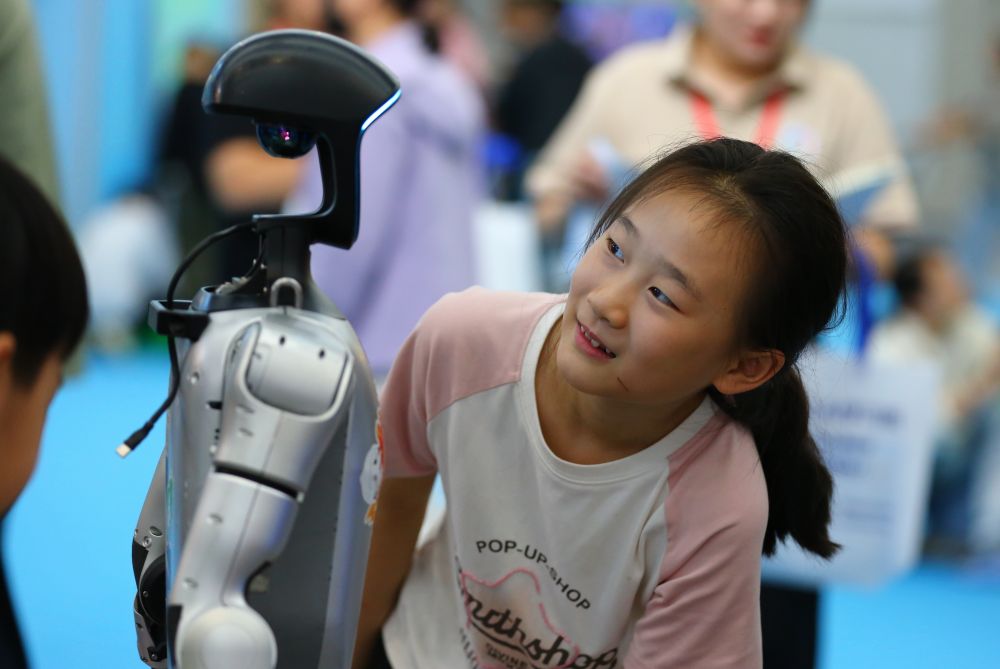 10月2日,在山東省第九屆滕州書(shū)展現(xiàn)場(chǎng),小朋友與機(jī)器人互動(dòng)。新華社發(fā)(李志軍攝)