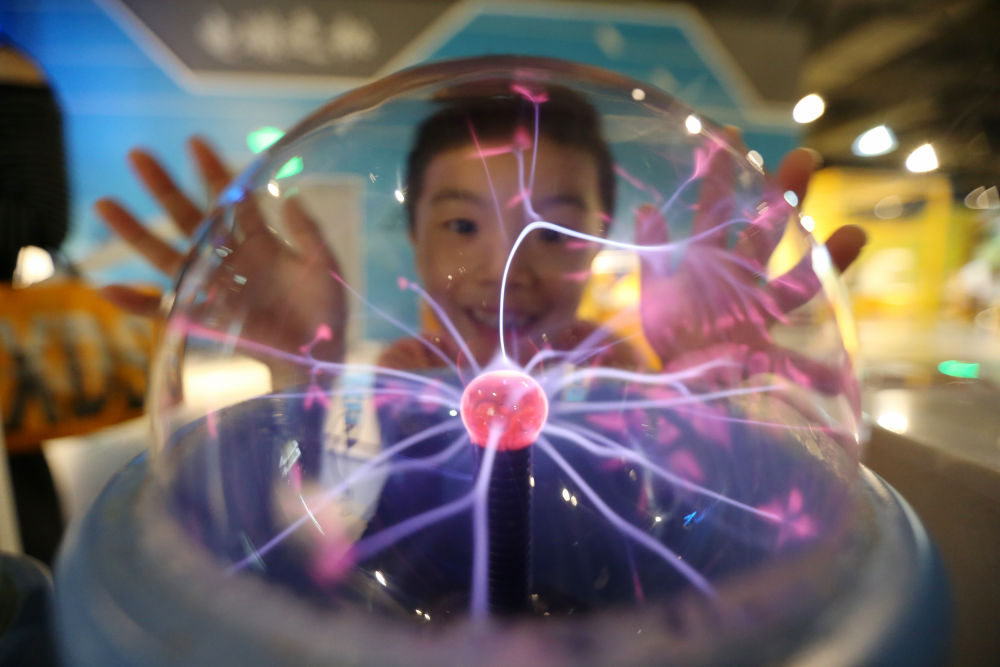 10月3日,小朋友在江蘇揚(yáng)州科技館體驗(yàn)“輝光球”。新華社發(fā)(孟德龍攝)