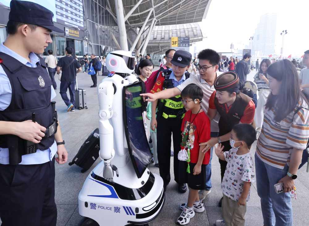 10月1日,在湖北省武漢站,小朋友和機(jī)器人互動(dòng)。新華社發(fā)(趙軍攝)