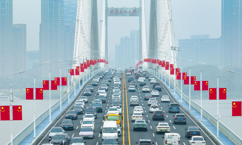 國(guó)慶假期第一天,各地迎來(lái)出行高峰。這是車(chē)輛行駛在湖北省武漢長(zhǎng)江二橋上(無(wú)人機(jī)照片,10月1日攝)。新華社記者 肖藝九 攝