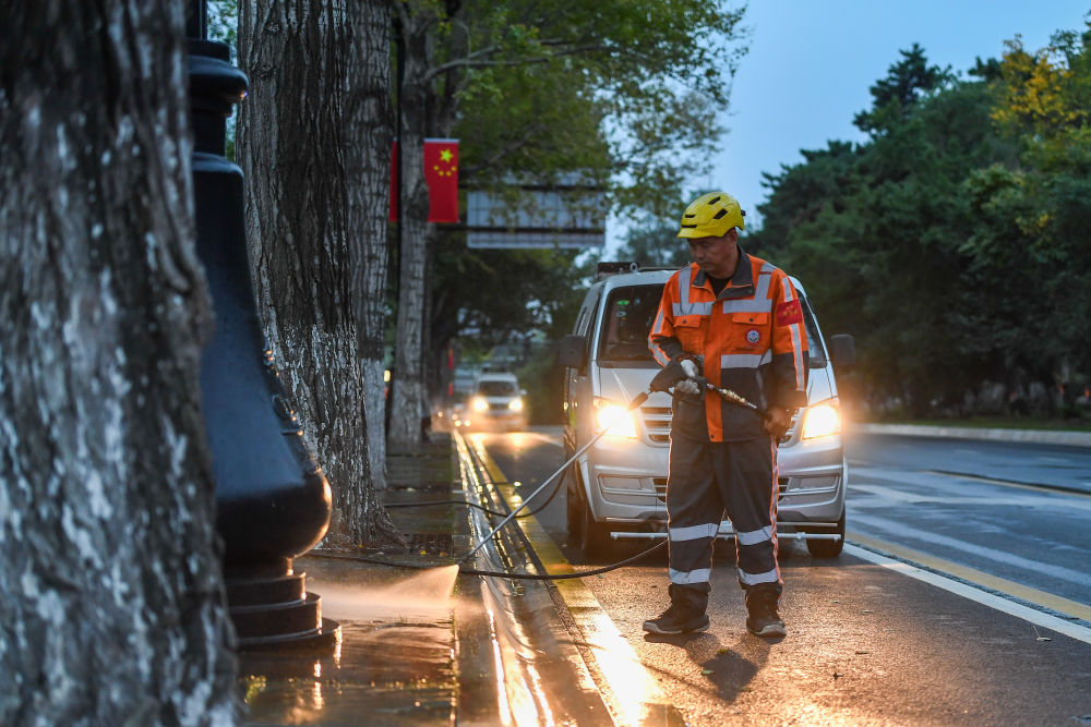 10月1日,環(huán)衛(wèi)工人在吉林省長(zhǎng)春市朝陽(yáng)區(qū)新民大街清掃人行步道。新華社記者 張楠 攝