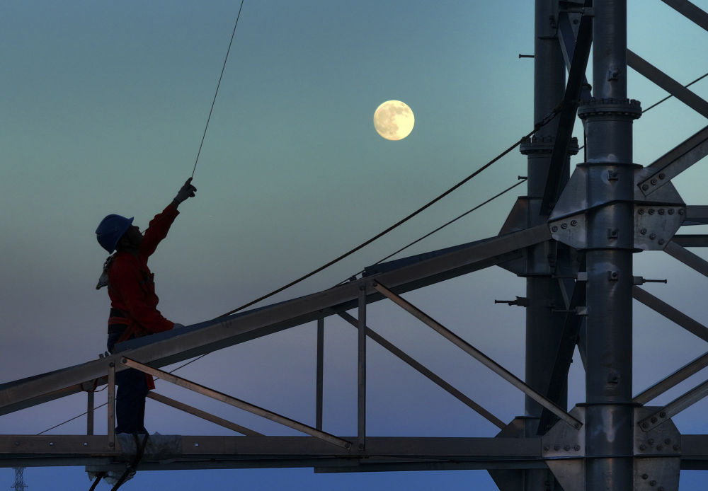 10月6日,在湖南省衡陽(yáng)市雁峰區(qū),高塔架線工人在月光的映射下施工(無(wú)人機(jī)照片)。新華社發(fā)(曹正平攝)