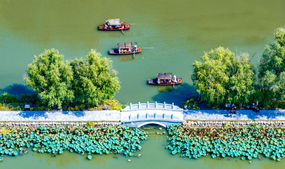 10月7日,游客在江蘇興化里下河國(guó)家濕地公園乘船游玩(無(wú)人機(jī)照片)。新華社發(fā)(周社根攝)