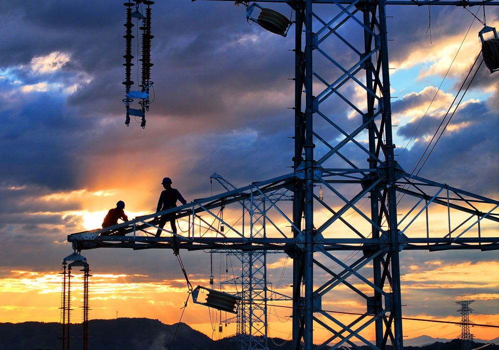 10月6日,在湖南省衡陽(yáng)市雁峰區(qū)南三環(huán)路上,湖南雁能建設(shè)集團(tuán)有限公司的施工人員在高塔進(jìn)行架線施工作業(yè)(無(wú)人機(jī)照片)。新華社發(fā)(曹正平攝)