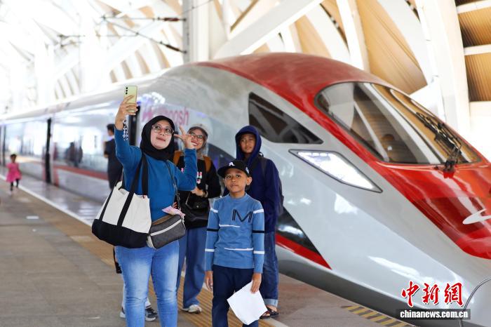 當(dāng)?shù)貢r間6月26日,旅客在印尼雅加達(dá)哈利姆高鐵站與列車合影。雅萬高鐵由中印尼兩國合作建設(shè),最高運(yùn)營時速350公里?!≈行律缬浾?李志全 攝