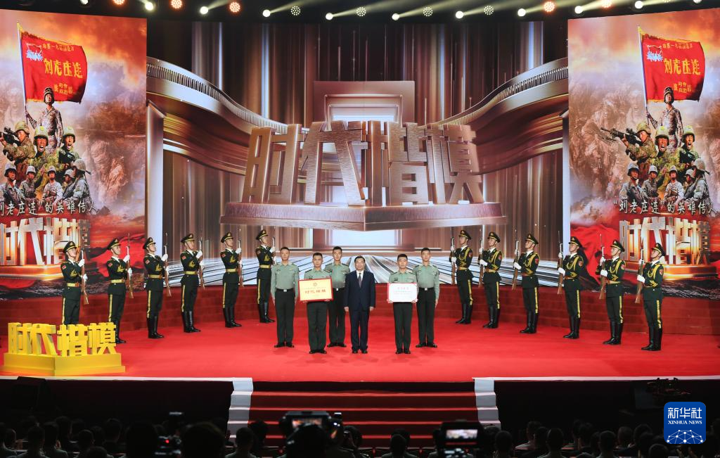 在“時代楷模”發(fā)布儀式上,陸軍某合成旅合成二營裝甲步兵一連(“劉老莊連”)官兵代表領取“時代楷?!豹勁坪妥C書(9月29日攝)。新華社記者 張永進 攝
