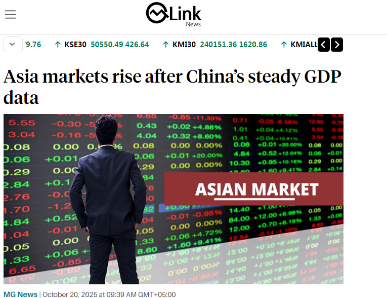 巴基斯坦金融網(wǎng)站Mettis Global Link發(fā)表題為《亞洲股市響應(yīng)中國(guó)穩(wěn)健GDP數(shù)據(jù)普漲》的文章。文章分析稱,亞洲市場(chǎng)20日迎來(lái)開(kāi)門紅,得益于中國(guó)的最新經(jīng)濟(jì)數(shù)據(jù)。中國(guó)第三季度GDP同比增長(zhǎng)4.8%,同時(shí)維持貸款市場(chǎng)報(bào)價(jià)利率(LPR)。股市方面,香港恒生指數(shù)大漲逾2%,內(nèi)地滬深300指數(shù)上漲0.74%。日經(jīng)225指數(shù)飆升近3%,首次突破49000點(diǎn)大關(guān),東證指數(shù)上漲2%。