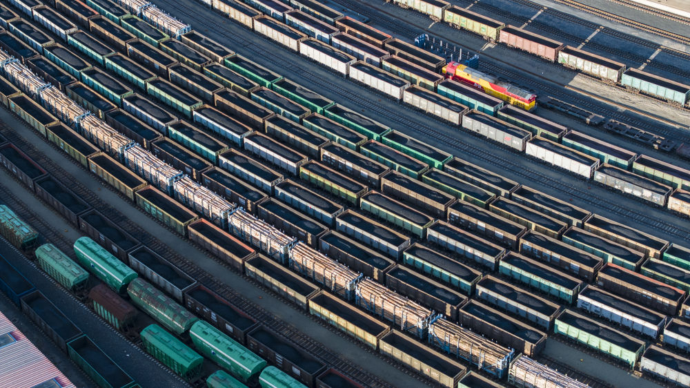 2025年10月18日,在中國鐵路哈爾濱局集團有限公司綏芬河站南場,滿載進口貨物的列車等待解體換裝(無人機照片)。新華社發(fā)(曲藝偉 攝)