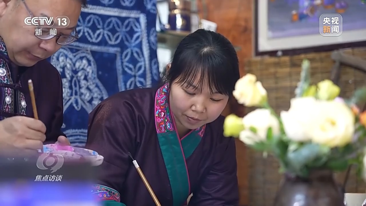 通過培訓(xùn)班的學(xué)習(xí),陳美美學(xué)到了如何將繪畫技術(shù)與自己的生活、當(dāng)?shù)氐拿褡逄厣Y(jié)合起來,加上業(yè)余時(shí)間自己的學(xué)習(xí)琢磨,她進(jìn)步很快,成了專業(yè)的畫師,畫作受到關(guān)注和歡迎。免費(fèi)的農(nóng)民畫培訓(xùn)班培養(yǎng)了一批批和陳美美一樣優(yōu)秀的三江農(nóng)民畫畫師,而培訓(xùn)只是第一步。