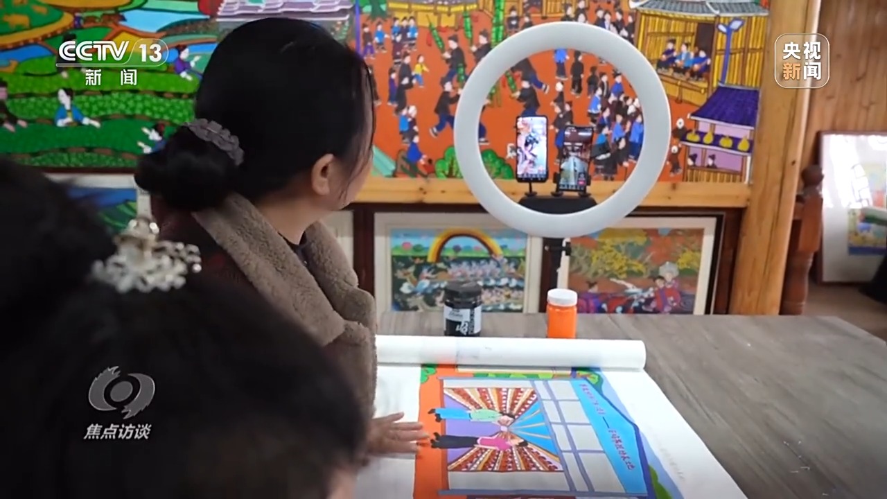獨(dú)峒鎮(zhèn)是三江農(nóng)民畫的起源地,鎮(zhèn)上的一家侗畫博物館展示著三江農(nóng)民畫的發(fā)展與歷史,還在二樓搭建了創(chuàng)作平臺(tái)。過去,不少人有事沒事喜歡在附近聚在一起喝酒、打牌。如今,閑暇時(shí)候,不少附近的村民還會(huì)來這里聚集,但吸引他們的卻是繪畫、交流。在二樓平臺(tái),有人還搭起架子,做起繪畫的直播。
