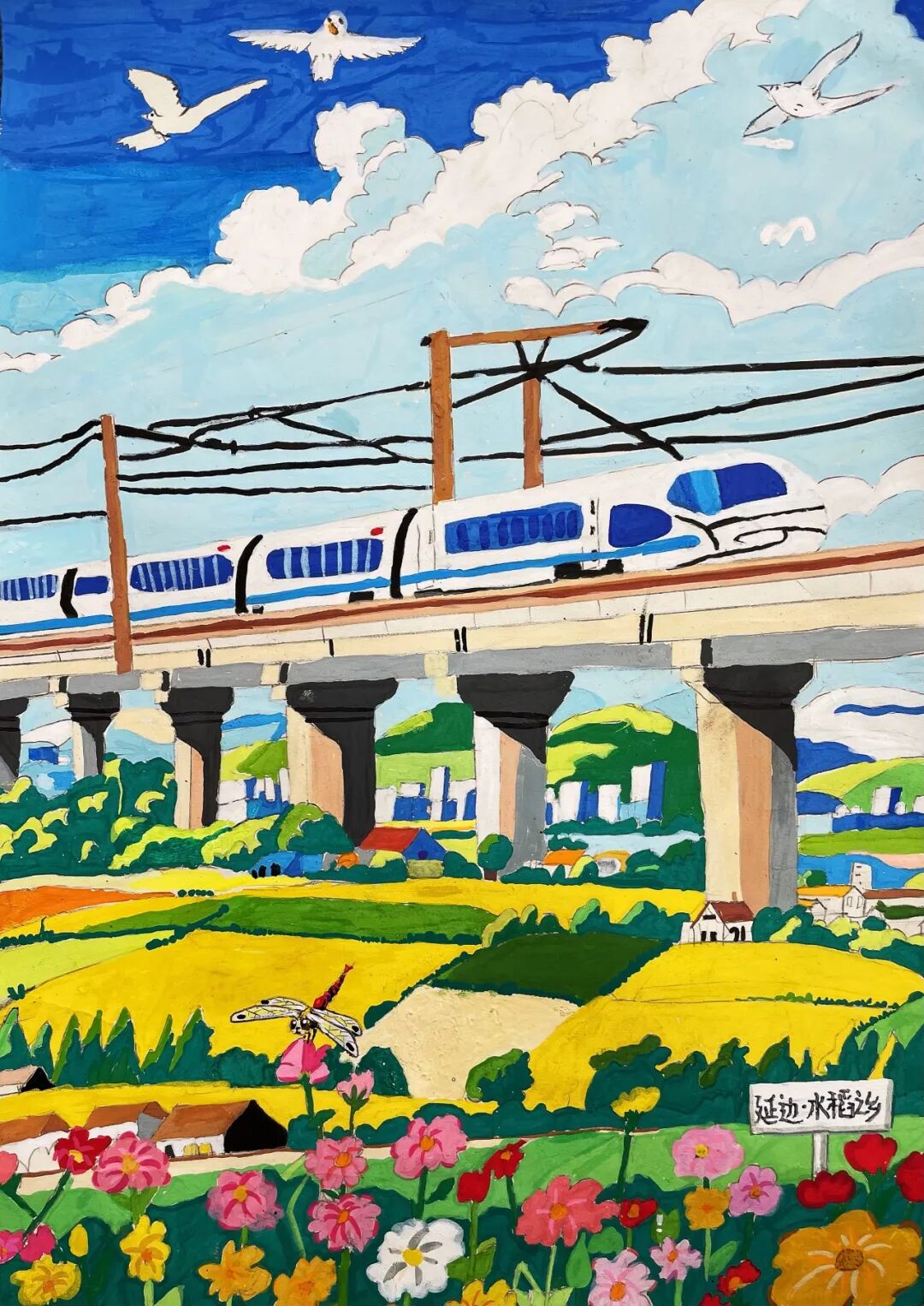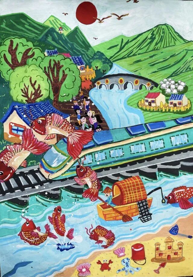 去年暑假,我和爸爸媽媽坐上普速列車去南京看望大爺爺。車窗外,九龍口濕地的蘆葦叢像綠色的波浪,成群的白鷺貼著水面掠過,偶爾還能看見漁民撐著小船在河道里穿梭。建湖特有的水鄉(xiāng)風(fēng)光漸漸后退,“哐當哐當”的車輪聲卻越來越清晰,仿佛是西塘河的流水聲化作了鋼軌上的旋律。鄰座的老爺爺笑著給我講起故事:“以前去南京,要先坐小船到碼頭,再轉(zhuǎn)汽車?,F(xiàn)在火車直接開到家門口,建湖和外面的世界更近啦!”他布滿皺紋的手輕輕摸著車窗,眼睛里閃著光。