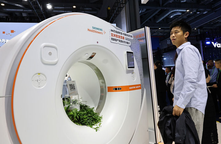 2025年11月6日,參觀者在進(jìn)博會(huì)西門子公司展臺(tái)一個(gè)CT機(jī)展品旁駐足觀看,這是西門子公司首款國產(chǎn)雙源光子計(jì)數(shù)CT,也是該產(chǎn)品亞洲首發(fā)首展。新華社記者 方喆 攝