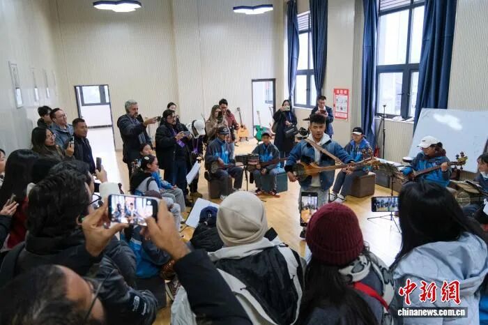 10月28日,拉美18個(gè)國(guó)家的21名記者、編輯等媒體從業(yè)者在西藏自治區(qū)林芝市巴宜區(qū)中學(xué)參訪,觀看師生們演奏藏族扎念琴。 中新社記者 江飛波 攝