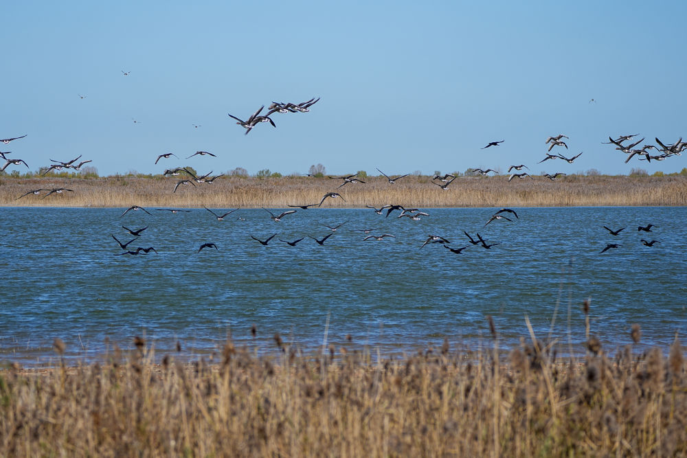 2025年11月13日,越冬候鳥在山東黃河三角洲國(guó)家級(jí)自然保護(hù)區(qū)飛翔。新華社記者 朱崢 攝