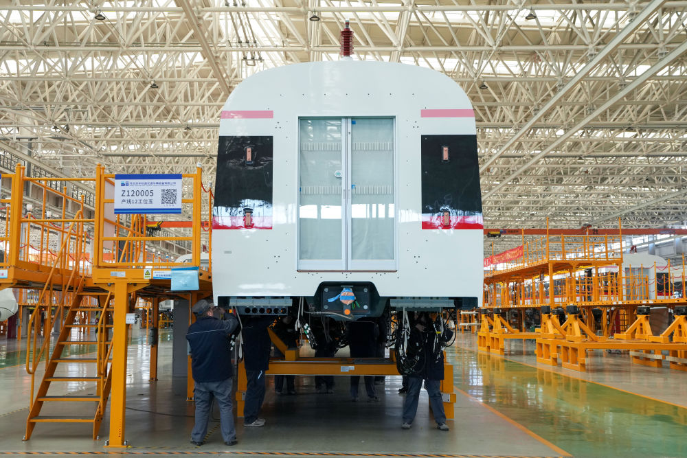 在京投裝備河北京車智能制造基地,工作人員在地鐵列車總裝車間內(nèi)工作(2025年2月14日攝)。京投裝備河北京車智能制造基地位于河北省保定市,采用“北京研發(fā)+河北制造” 模式運營,是貫徹京津冀協(xié)同發(fā)展戰(zhàn)略的重要項目。新華社記者 鞠煥宗 攝