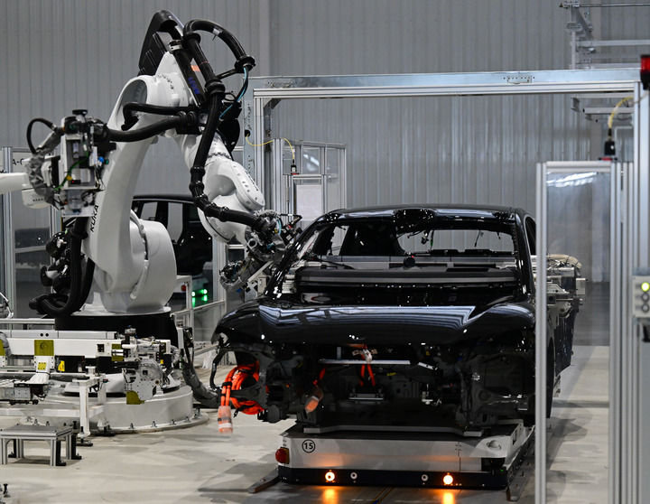 2025年7月1日在合肥市新橋智能電動汽車產業(yè)園蔚來第二工廠拍攝的新能源汽車生產線。新華社記者 周牧 攝